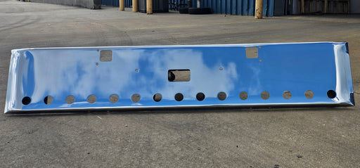 Kenworth W900L premium 8 gauge chrome 18" boxed end bumper w/standard tow, step, & mounting holes, 15 round 2" light holes