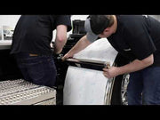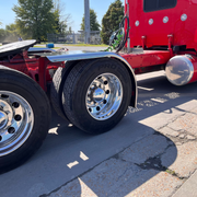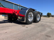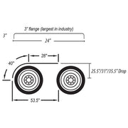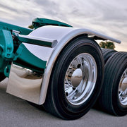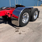 24" wide with a 3" flange. Each fender has a 40" radius and 35.5" drop. Manufactured in the USA from 14 gauge, 430 grade stainless steel.